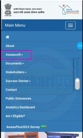 सबसे पहले आवेदक PMAYG की आधिकारिक वेबसाइट – https://pmayg.nic.in/ पर विजिट करें। इसके बाद आपके सामने PM Gramin Awas Yojana पोर्टल का होमपेज खुल जाएगा। अब होमपेज पर आप ऊपर Menu सेक्शन में Aawassoft के विकल्प को ढूंढे और क्लिक करें।