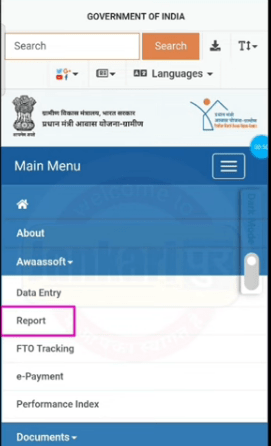 ग्रामीण सूची देखने की प्रक्रिया सबसे पहले आधिकारिक वेबसाइट – https://pmayg.nic.in/ पर विजिट करें. अब आपके सामने प्रधान मंत्री आवास योजना – ग्रामीण का होमपेज खुल जाएगा. यहाँ ऊपर मेनू बार में मौजूद विकल्प Awassoft पर क्लिक करें. अब ड्रॉप डाउन मेनू में मौजूद आप Report विकल्प पर क्लिक करें.