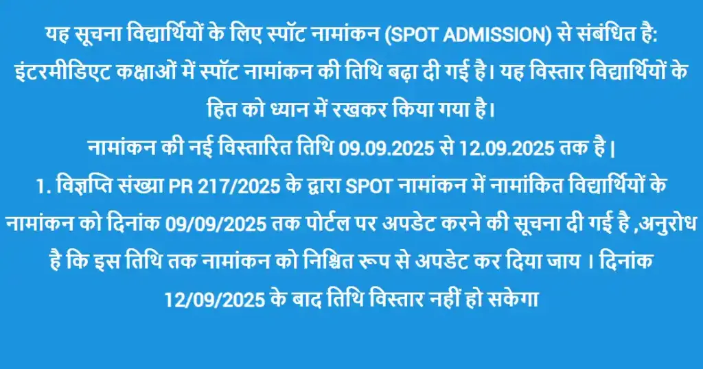 09 सितंबर 2025 से Spot Admission शुरू हो गई हैं। और जारी किये नोटिस के अनुसार ये फॉर्म 12 सितंबर 2025 के बाद फिर से ओपन नहीं किये जायेंगे। तो जो भी स्टूडेंट्स फॉर्म भरना चाहते हैं वो 12 तारीख तक जल्दी से आवेदन करें।