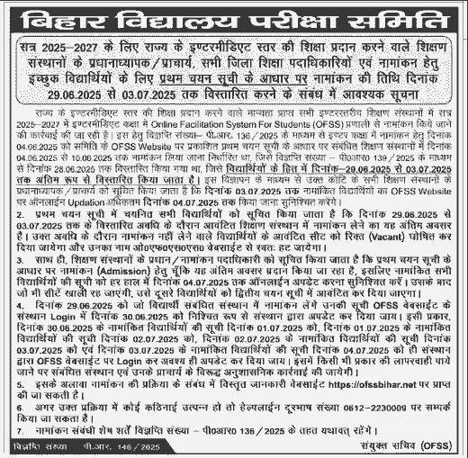 Eleventh Spot Admission Begin 2025: Bihar Faculty Examination Board (BSEB) हर साल Intermediate (Class Eleventh) Admission के लिए एक OFSS – On-line Facilitation System for College students के माध्यम से छात्रों को प्रवेश देती है। जो भी छात्र और छात्राएं इस सत्र 2025-27 में कक्षा 11वीं में नामांकन के लिए ऑनलाइन आवेदन नहीं कर पाए हैं। तो उनके लिए जरुरी सुचना आई हैं। BSEB ने स्पॉट नामांकन (Spot Admission) भरने की तिथि को बढ़ा दिया है। अब स्टूडेंट 09 September 2025 से 12 September 2025 तक ऑफिसियल वेबसाईट ofssbihar.internet पर जा कर फॉर्म भर सकते हैं।
