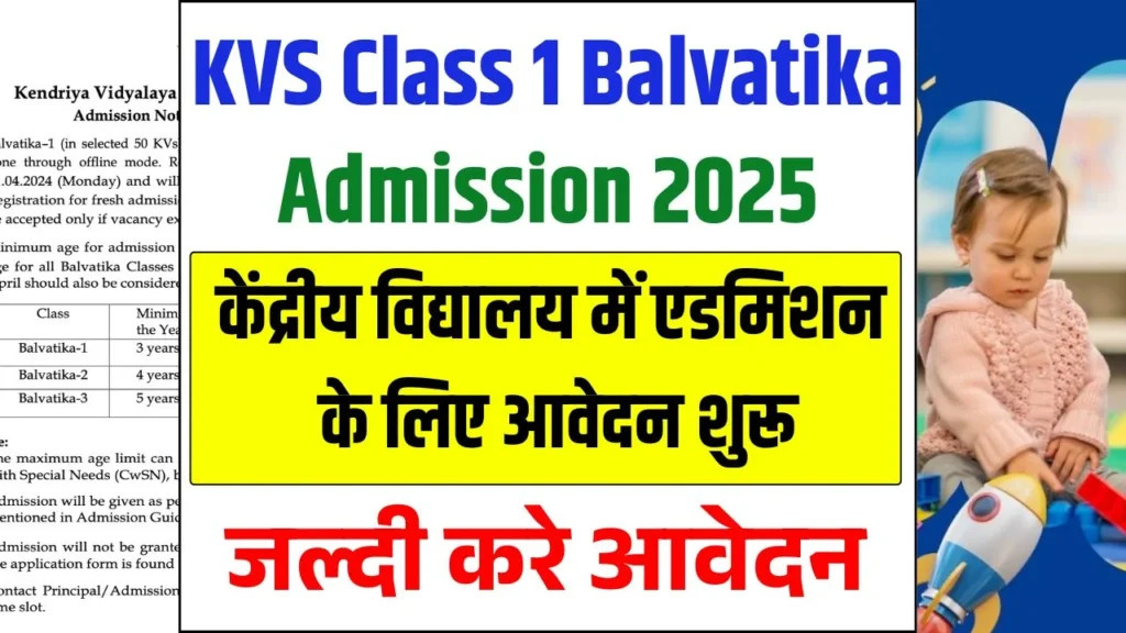 KVS Class 1 Balvatika Admission 2025: केंद्रीय विद्यालय संगठन की ओर से बाल वाटिका 1 व 3 और कक्षा 1 में एडमिशन के लिए ऑनलाइन आवेदन करने की प्रक्रिया 07 मार्च 2025 से शुरू की जा चुकी हैं। यदि आप भी अपने बच्चे का एडमिशन इसमें करवाना चाहते हैं, तो आप इसकी आधिकारिक वेबसाइट पर जाकर ऑनलाइन आवेदन फार्म भर सकते हैं।