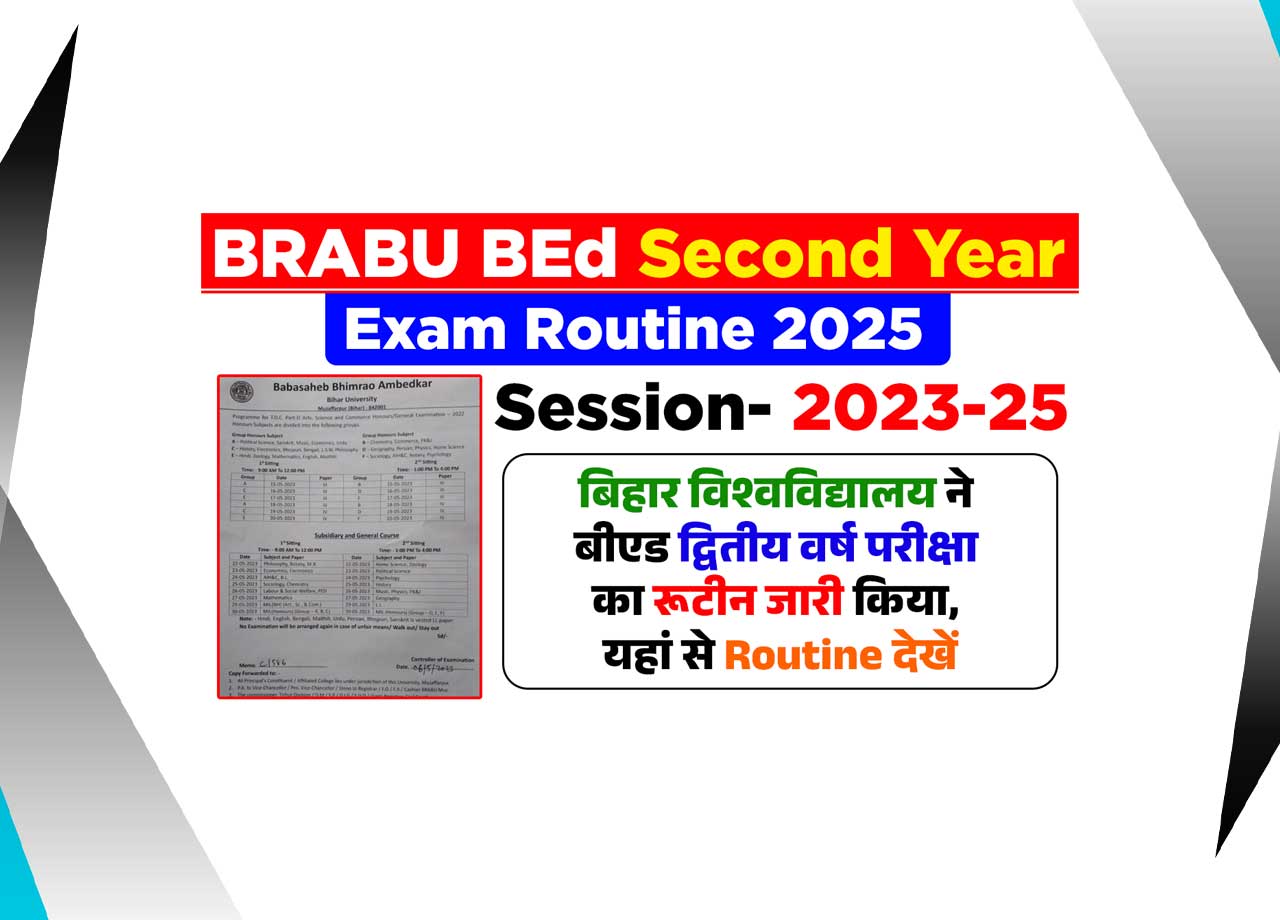 BRABU BEd Second 12 months Examination Routine 2025 – नमस्कार दोस्तों, यदि आप भी बाबासाहेब भीमराव अम्बेडकर बिहार विश्वविद्यालय, मुजफ्फरपुर से शैक्षणिक सत्र 2023-25 से बीएड में नामांकन लिए है, तो आपके लिए बहुत बड़ी खुशखबरी हैं। यूनिवर्सिटी ने अधिकारिक रूप से फाइनल परीक्षा यानी द्वितीय वर्ष की परीक्षा रूटीन को जारी कर दिया हैं। सभी विद्यार्थी इस लेख के माध्यम से परीक्षा रूटीन को दिखे पाएंगे एवं डाऊनलोड कर पाएंगे। इसके साथ ही साथ परीक्षा से संबंधित सारी जानकारी प्राप्त कर पाएंगे। इसलिए लेख को ध्यान पूर्वक शुरू से अंत तक पढ़े……