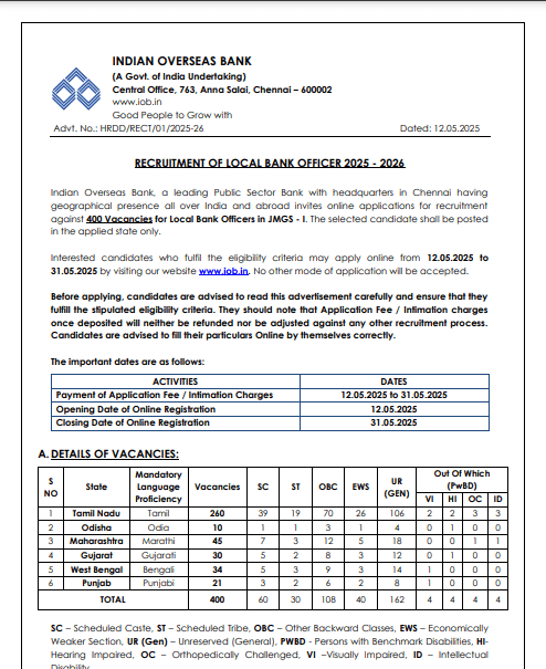 इंडियन ओवरसीज बैंक मे आई लोकल बैंक ऑफिशर्स ( LBO ) की नई भर्ती, जाने क्या है पूरी भर्ती, आवेदन प्रक्रिया और अप्लाई करने की लास्ट डेट – Indian Abroad Financial institution LBO Recruitment 2025?