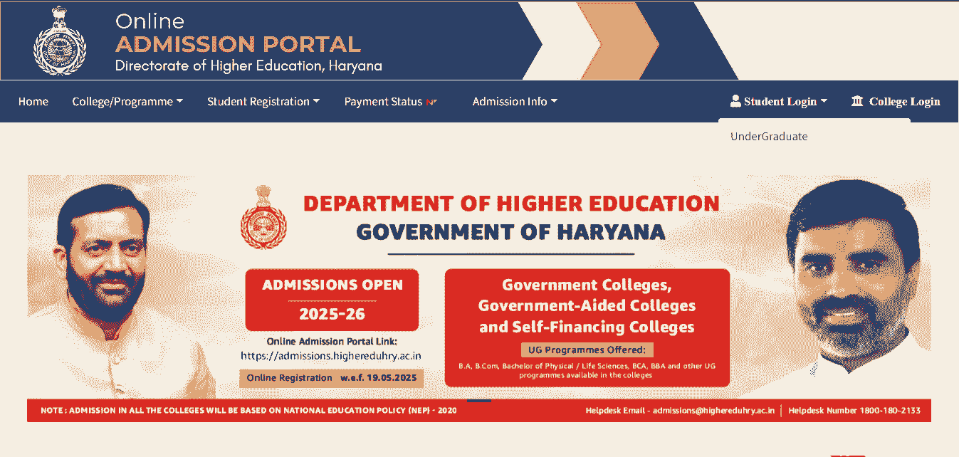 - Haryana UG Admission 2025 हेतु ऑनलाइन आवेदन करने के लिए सर्वप्रथम आपको इसकी Official Web site के होम – पेज पर आना होगा जो कि, इस प्रकार का होगा –
