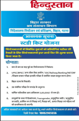 Bihar Research Equipment Yojana 2025: यदि आप भी बिहार के रहने वाले है और प्रतियोगी परीक्षा जैसे कि – UPSC / BPSC / SSC / Railway / Banking / NET / JRF / CTE आदि की तैयारी कर रहे है तो आपकी तैयारी को और भी बेहतरीन बनाने के लिए निदेशालय नियोजन एंव प्रशिक्षण, बिहार, पटना द्धारा बिहार स्टडी कीट योजना के तहत बिलकुल फ्री मे स्टडी कीट का लाभ दिया जा रहा है जिसका लाभ आप सभी प्राप्त कर इसके लिए आपको आर्टिकल मे Bihar Research Equipment Yojana 2025 के बारे मे बतायेगें जिसके लिए आपको धैर्यपूर्वक इस आर्टिकल को पढ़ना होगा ताकि आप पूरी – पूरी जानकारी प्राप्त कर सकें।