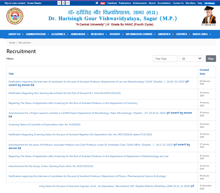 डॉ. हरीसिंह गौर यूनिवर्सिटी ने निकाली नॉन टीचिंग पोस्ट्स पर नई भर्ती, जाने क्या है पूरी भर्ती, आवेदन प्रक्रिया और अप्लाई करने की लास्ट डेट – DHSGS College Non-Educating Recruitment 2025?