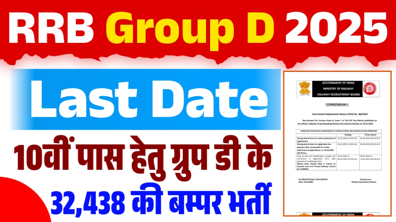 अपने इस आर्टिकल मे हम, आप सभी आवेदको सहित उम्मीदवारों का हार्दिक स्वागत करना चाहते है जो कि, रेलवे भर्ती बोर्ड / आर.आर.बी के तहत ग्रुप डी के तहत विभिन्न पदों पर नौकरी प्राप्त करना चाहते है उनके लिए बड़ी खबर है कि, रेलवे भर्ती बोर्ड द्धारा ग्रुप डी के पदों पर भर्ती हेतु अप्लाई करने की लास्ट डेट को बढ़ा दिया गया है और इसीलिए हम, आपको इस आर्टिकल मे विस्तार से RRB Group D Final Date 2025 के बारे मे बतायेगें जिसके लिए आपको धैर्यपूर्वक इस आर्टिकल को पढ़ना होगा।