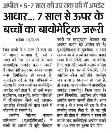 Aadhar Card Child Biometric Update Newspaper Cutting Screenshot.