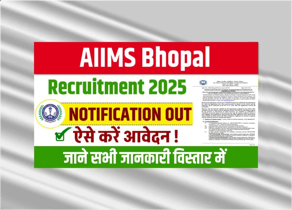 AIIMS Bhopal Recruitment 2025:- अखिल भारतीय आयुर्विज्ञान संस्थान, भोपाल (AIIMS Bhopal) ने सीनियर रेजिडेंट (नॉन एकेडमिक) पदों पर भर्ती करने के लिए आधिकारिक नोटिफ़िकेशन बीते 09 मई 2025 को जारी कर दिया है। इस भर्ती के तहत कुल 67 पदों पर सीनियर रेसिडेंट्स की नियुक्तियाँ की जाएंगी। जिसमें 67 में से 40 पदों पर रेगुलर बेसिस पर नियुक्तियाँ होंगी और शेष 27 पद विभिन्न विभागों की शैक्षणिक रिक्तियों से भरे जाएंगे।