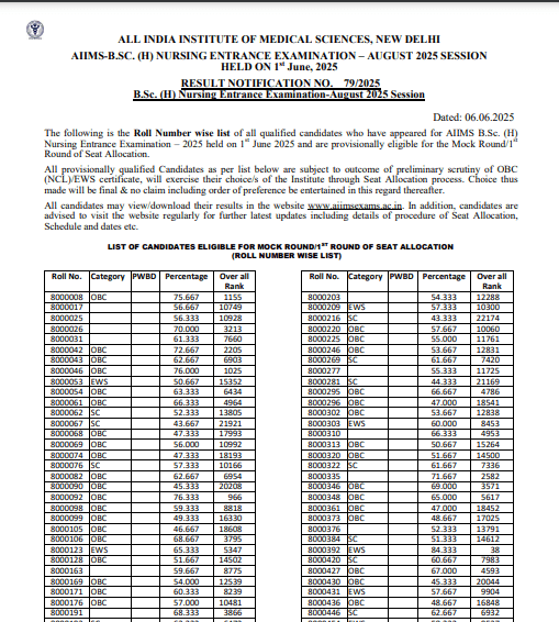 वहीं अभ्यर्थियों को बता दें कि, AIIMS BSc Nursing Outcome 2025 के तहत रोल नंबर वाइज रिजल्ट पीडीएफ को जारी किया गया है जिसमे अपना – अपना रिजल्ट को चेक करने के लिए आपको अपने साथ अपना रोल नंबर तैयार रखना होगा ताकि आप आसानी से अपना रिजल्ट चेक कर सकें तथा