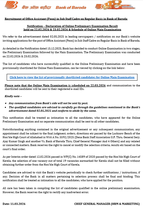 Financial institution of Baroda Workplace Assistant (Peon) 2026 Outcome Out: जिन भी उम्मीदवारों ने Financial institution of Baroda Workplace Assistant (Peon) Preliminary On-line Examination 2026 दिया था और अब इसके रिजल्ट का इंतजार कर रहे थे, तो उनके लिए एक बड़ी अपडेट सामने आ गई है। आपको बता दें कि Financial institution of Baroda ने Workplace Assistant (Peon) Preliminary Examination का Outcome 11 मार्च 2026 को जारी कर दिया है।