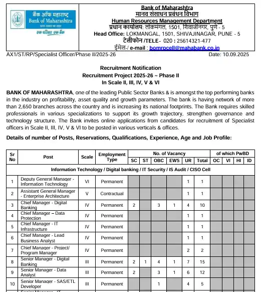 10 सितंबर को Financial institution of Maharashtra, ने Financial institution of Maharashtra SO Recruitment 2025 की नई भर्तियों के लिए नोटिफिकेशन निकला है। Recruitment Notification Recruitment Undertaking 2025-26 – Section II के अनुसार स्पेशलिस्ट ऑफिसर (SO) की लगभग 350 रिक्तियों की आवेदन प्रक्रिया शुरू हो गई है जो भी योग्य उम्मीदवार है वे आज से आवेदन करना शुरू कर सकते हैं। यह भर्ती विभिन्न क्षेत्रों जैसे आईटी, डिजिटल बैंकिंग, ट्रेजरी, लीगल, क्रेडिट, रिस्क और मार्केटिंग के लिए है। अधिसूचना में सभी पोस्टों का नाम, वसांइस लिस्ट, आवेदन की तिथि और योग्यता के बारे में बताया है।