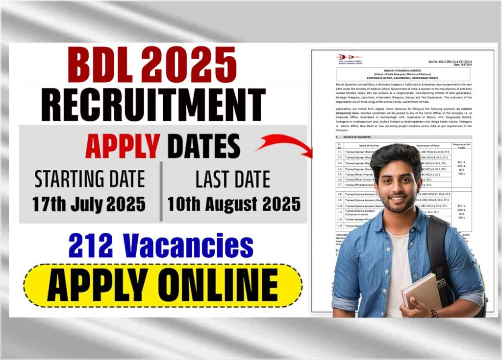 BDL Recruitment 2025: आप सभी योग्य आवेदक जो कि, भारत डायनेमिक्स लिमिटेड मे ट्रैनी इंजीनियर और ट्रैनी डिप्लोमा असिसटेन्ट के पद पर नौकरी प्राप्त करना चाहते है उनके लिए BHARAT DYNAMICS LIMITED द्धारा 200+ पदों पर नया भर्ती नोटिफिकेशन जारी करते हुए BDL Recruitment 2025 को जारी कर दिया है जिसमे सबी योग्य आवेदक 17 जुलाई, 2025 से लेकर 10 अगस्त, 2025 तक अप्लाई कर सकते है।