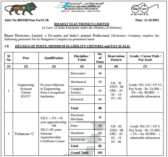 इस भर्ती के तहत कुल 162 पद हैं, जिनमें 80 इंजीनियरिंग असिस्टेंट ट्रेनी और 82 टेक्नीशियन ‘C’ के पद शामिल हैं।