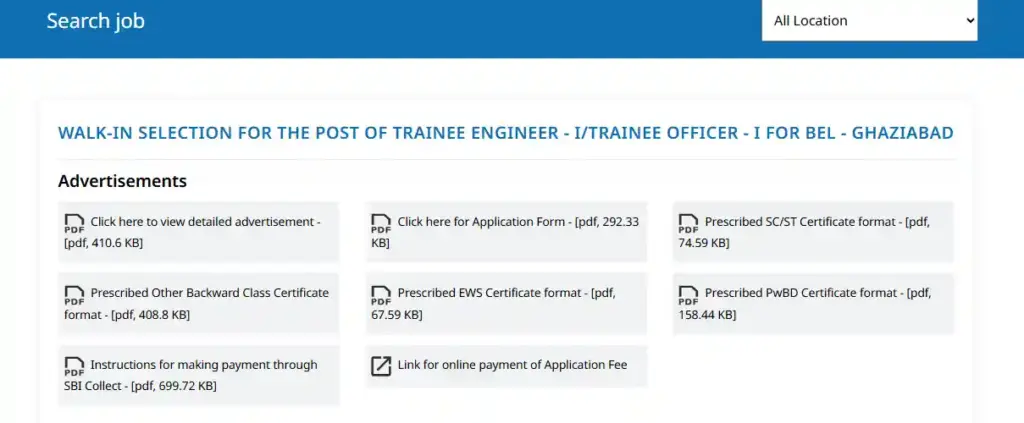 - फिर नया पेज ओपन होगा, यहाँ आपको ‘WALK-IN SELECTION FOR THE POST OF TRAINEE ENGINEER – I/TRAINEE OFFICER – I FOR BEL – GHAZIABAD’ सेक्शन में ‘ Click on right here for Software Kind – [pdf, 292.33 KB]’ की ऑप्शन पर क्लिक करना है।