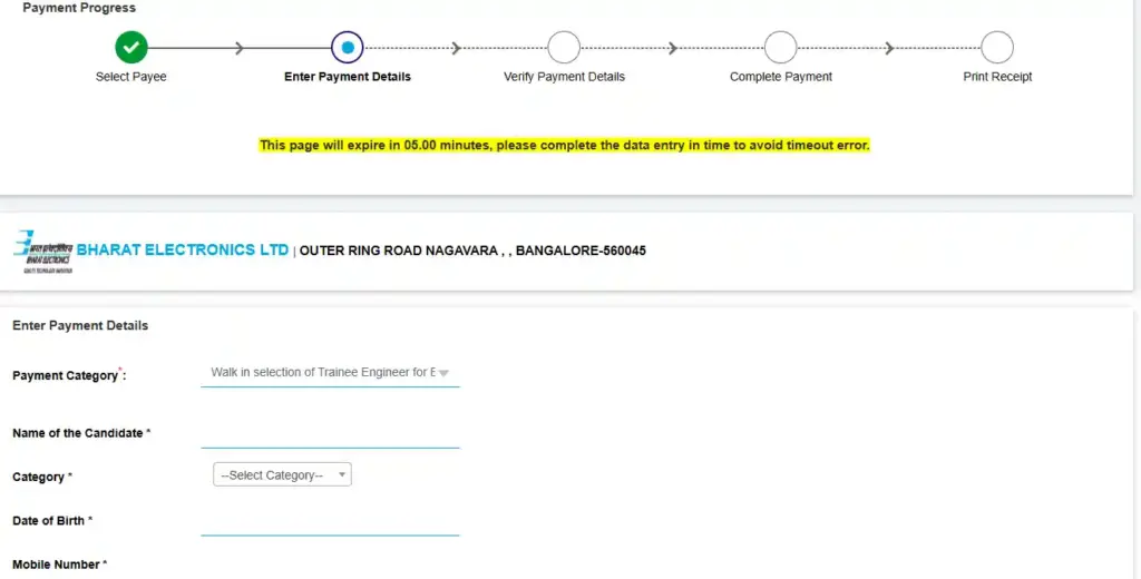 - Fee Class में WALK-IN SELECTION of TRAINEE ENGINEER BEL GAD सेलेक्ट करें और अपना नाम, कैटेगेरी, मोबाइल नंबर सब डालें।