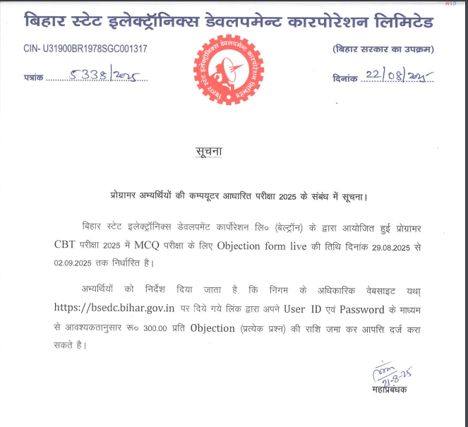 - इसी सेक्शन मे आपको Objection Hyperlink for BSEDC Programmer Examination: Open from Aug 29, 2025, 10:00 AM to Sep 2, 2025, 11:55 PM. For queries, contact Assist Desk at 917996149111 or helpdeskprogrammer@gmail.com का विकल्प मिलेगा जिस पर आपको क्लिक करना होगा,