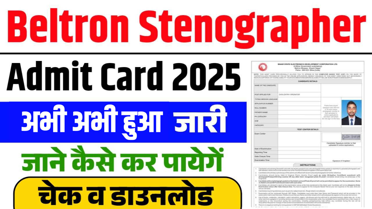 अपने इस आर्टिकल में हम, आप सभी युवाओं व आवेदको का हार्दिक स्वागत करना चाहते है जो कि, बिहार बैल्ट्रोन मे स्टेनोग्राफर के पद पर भर्ती परीक्षा मे बैठना चाहते है और अपने – अपने स्टेनोग्राफर एडमिट कार्ड के जारी होने का इंतजार कर रहे है उन्हें हम, इस आर्टिकल की मदद से विस्तार पूर्वक Beltron Stenographer Admit Card 2025 के बारे मे बताना चाहते है जिसकी पूरी विस्तृत जानकारी प्राप्त करने हेतु आपको हमारे साथ बने रहना होगा ताकि आप पूरी – पूरी जानकारी प्राप्त कर सकें।
