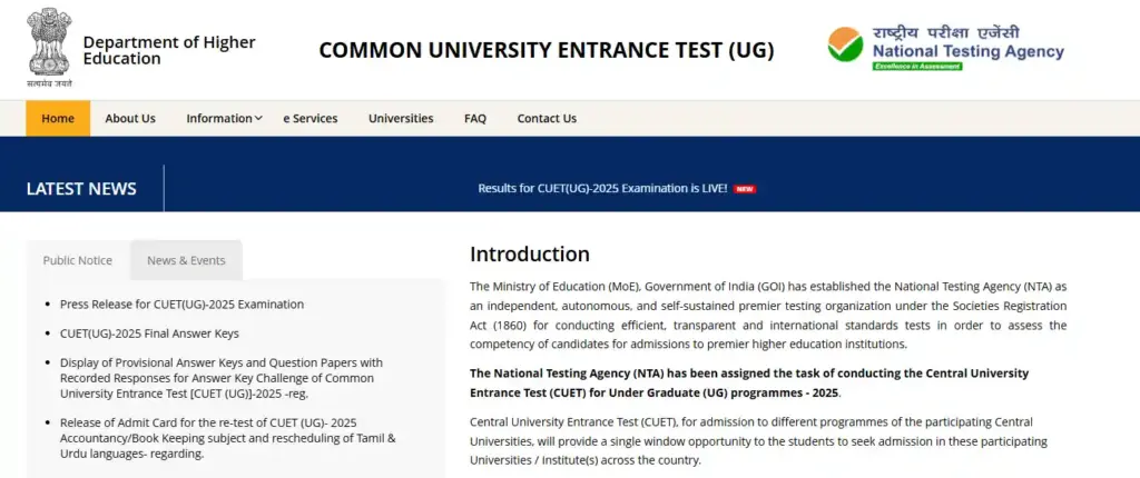 CUET UG 2025 official website, where students can apply and appear for the BFA in Sculpture entrance exam
