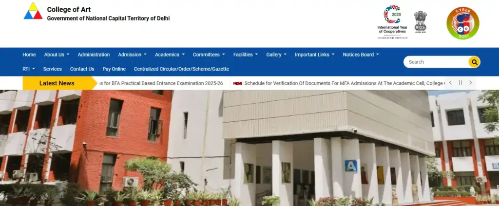 College of Art Delhi official website showing BFA in Sculpture course details and admission-related academic information