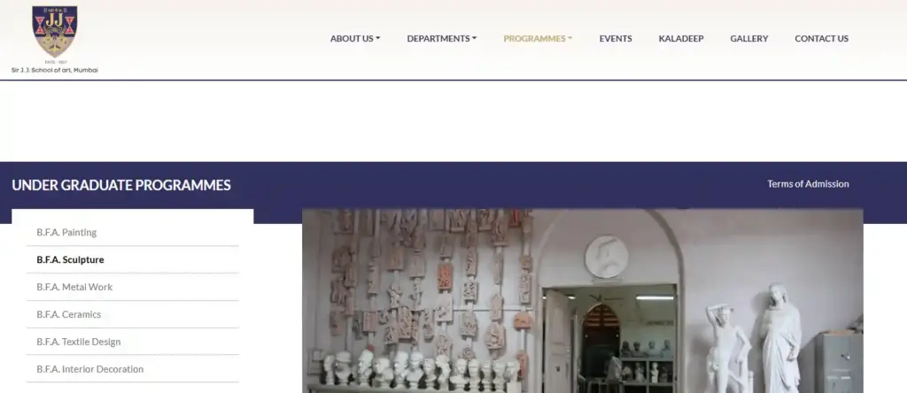 Sir JJ School of Art Mumbai website showing information about BFA in Sculpture course and admission procedure