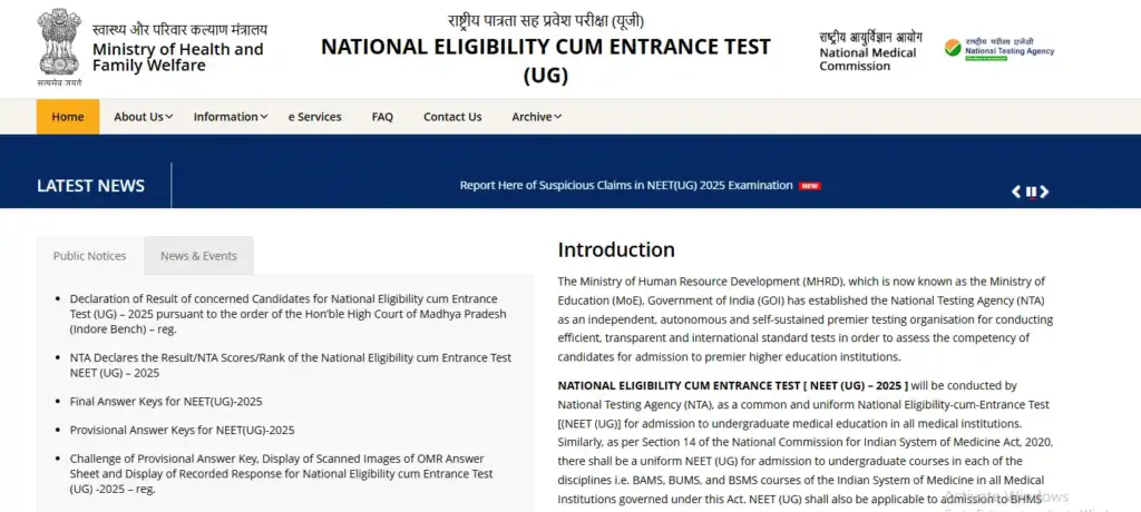 Official NEET UG website homepage for National Eligibility Entrance Test 2025 guiding admission to BHMS course in India