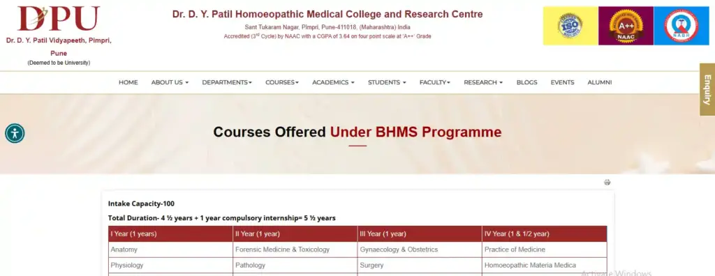 Dr. DY Patil Homeopathic Medical College Pune official website showing BHMS Course details, duration, intake capacity and subjects
