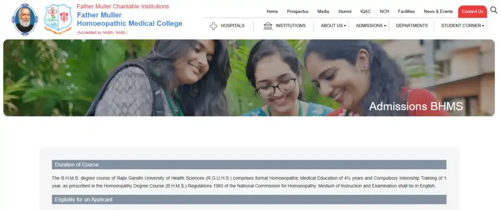 Father Muller Homeopathic Medical College Mangalore official website highlighting BHMS Course admission details, duration, eligibility and curriculum information