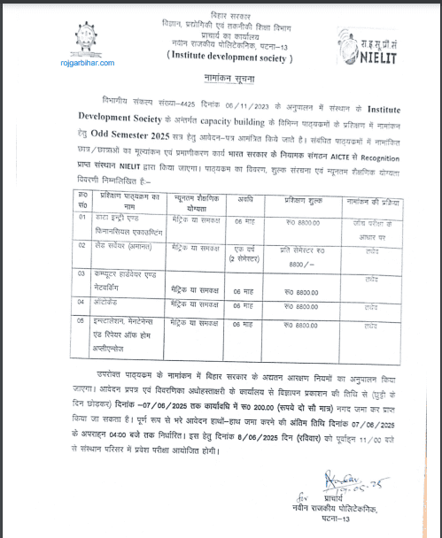 • अन्त मे, आपको 07 जून, 2025 की शाम 4 बजे तक विज्ञान, प्रघोगिकी एंव तकनीकी शिक्षा विभाग का कार्यालय, नवीन राजकीय पॉलिटेकनिक, पटना – 13 मे अपने आवेदन पत्र सहित सभी दस्तावेजों को जमा करके इसकी पावती / रसीद को प्राप्त कर लेना होगा आदि।