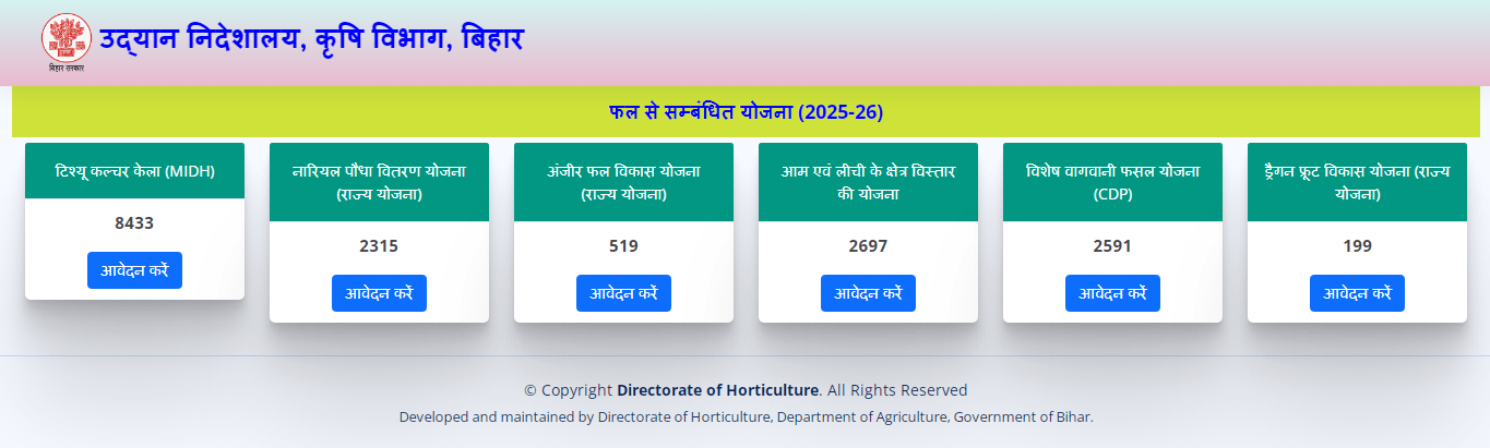 - अब यहां पर आपको ” फल से संबंधि योजना ” के नीचे ही ” आवेदन करें ” का विकल्प मिलेगा जिस पर आपको क्लिक करना होगा,