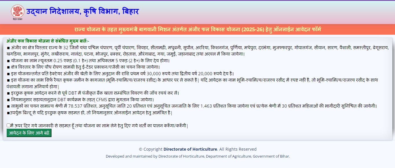 योग्य किसानों को बता दें कि, Bihar Anjeer Vikas Yojana 2025 मे आवेदन करने के लिए प्रत्येक किसान को ऑनलाइन माध्यम को अपनाते हुए आवेदन करना होगा जिसमे आपको कहीं पर कोई समस्या ना हो इसके लिए हम, आपको पूरी – पूरी आवेदन प्रक्रिया की जानकारी प्रदान करेगें ताकि आप आसानी से इस योजना मे आवेदन करके योजना का लाभ प्राप्त कर सकें।