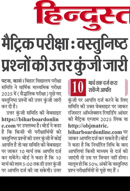 2. समिति की वेबसाईट पर अपलोड वस्तुनिष्ठ प्रश्नों के Reply Key के संबंध में यदि किसी भी व्यक्ति / व्यक्तियों (परीक्षार्थियों सहित) को कोई आपत्ति /आपत्तियाँ हो, तो वे दिनांक 10.03.2025 के अपराह्न 05:00 बजे तक समिति के उक्त वेबसाईट https://biharboardonline.com पर दिये गये Hyperlink “Register objection relating to Reply Key Matric Examination 2025” अथवा http://objmatric.biharboardonline.com पर जाकर अपनी आपत्ति /आपत्तियाँ दर्ज कर सकते हैं।
