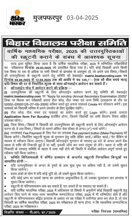 Bihar Board tenth Scrutiny On-line Apply 2025 ~ सम्पूर्ण जानकारी
