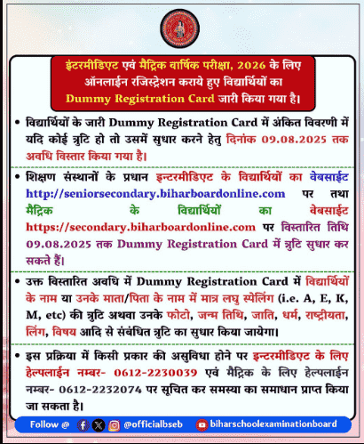 यदि पंजीयन पत्र में किसी प्रकार की गलती (जैसे नाम, जन्मतिथि, विषय, लिंग आदि) पाई जाती है, तो छात्र उसे समय रहते अपने विद्यालय के माध्यम से सुधार करवा सकते हैं। आपको बता दें कि इस डमी रजिस्ट्रेशन कार्ड को 05 जुलाई 2025 से 09 अगस्त, 2025 तक ही डाउनलोड किया जा सकता है।