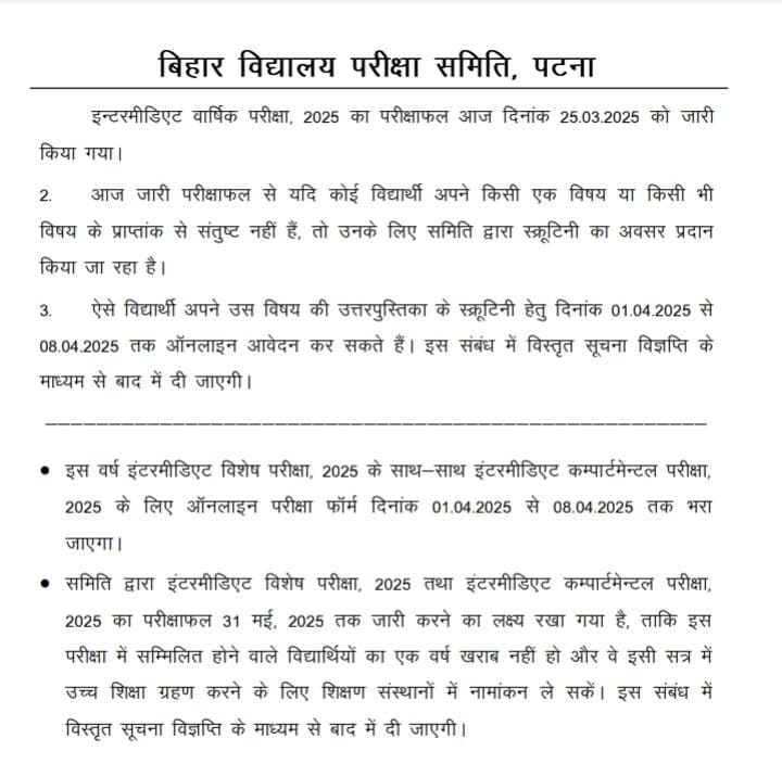 • यदि इंटर वार्षिक परीक्षा, 2025 मे अधिकतम 2 विषयो में अनुतीर्ण कोई विद्यार्थी स्क्रूटनी हेतु आवेदन किए जाने के साथ – साथ इंटर कम्पार्टमेंट परीक्षा, 2025 मे भी सम्मिलित होता है और स्क्रूटनी के परिणामस्वरुप वर्धित प्राप्तांक के आधार पर वह परीक्षा मे उत्तीर्णता प्राप्त कर लेता है तो उस विद्यार्थी का इंटर वार्षिक परीक्षा, 2025 का परीक्षाफल ही मान्य होगा  ना कि, इंटर कम्पार्टमेंटल परीक्षा, 2025 का परीक्षाफल आदि।