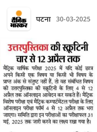 Bihar Board Matric Scrutiny Kind 2025 भरने की प्रक्रिया को शुरु किया जाएगा |