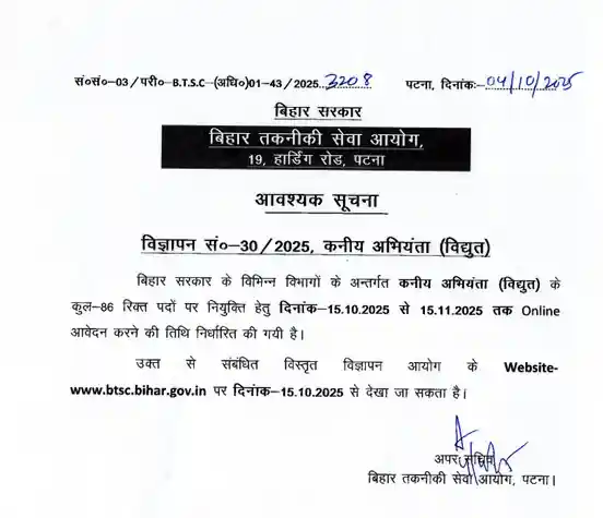 अगर आप भी बिहार में नौकरी लेना चाहते हैं और इन पदों पर आवेदन करना चाहते है तो आपका हमारे लेख में स्वागत है। आपको बता दें कि बिहार तकनीकी सेवा आयोग (BTSC) ने 4 अक्टूबर 2025 को शॉर्ट नोटिफिकेशन जारी किया है। जिसके अनुसार BTSC ने अलग – अलग पदों पर कुल 4654 रिक्तियों के लिए आवेदन मांगे है। इन भर्तियों के लिए पूरी नोटिफिकेशन आधिकारिक वेबसाइट पर 10 अक्टूबर 2025 और जूनियर इंजीनियर के पदों के लिए 15 अक्टूबर 2025 को जारी की जाएगी।