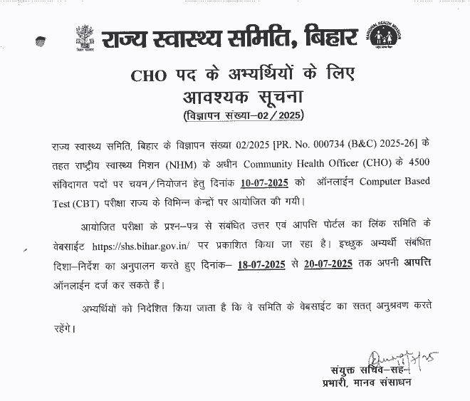 आप सभी अभ्यर्थियों को बता देना चाहते है कि, स्टेट हेल्थ सोसाईटी बिहार द्धारा 18 जुलाई, 2025 के दिन Bihar CHO Reply Key 2025 को जारी कर दिाय गया है।