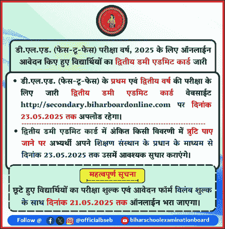 सभी अभ्यर्थी जो कि, Bihar Deled 2nd Dummy Admit Card 2025 मे त्रुटि पाते है और त्रुटि सुधार करना चाहते है वे 23 मई, 2025 तक त्रुटि सुधार कर सकते है।