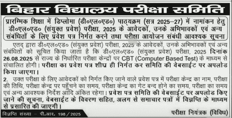 Bihar Deled Entrance Examination Admit Card 2025: क्या आप भी बिहार बोर्ड द्धारा आयोजन किए जाने वाले ” डी.एल.एड ( संयुक्त प्रवेश ) परीक्षा, 2025 ” मे बैठने वाले है तो आप सभी अभ्यर्थियों के लिए बड़ी खबर है कि, बिहार बोर्ड द्धारा नोटिस जारी करते हुए Bihar Deled Entrance Examination Date 2025 को जारी कर दिया है और दूसरी बड़ी खुशखबरी है कि, बोर्ड द्धारा 21 अगस्त, 2025 के दिन Bihar Deled Examination Admit Card 2025 को जारी कर दिया गया है जिसकी आपको लाईव अपडेट सबसे पहले इस प्लेटफॉर्म पर प्रदान की जाएगी।