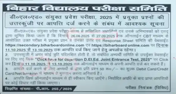 Notification of Bihar DElEd Entrance Exam Answer Key 2025