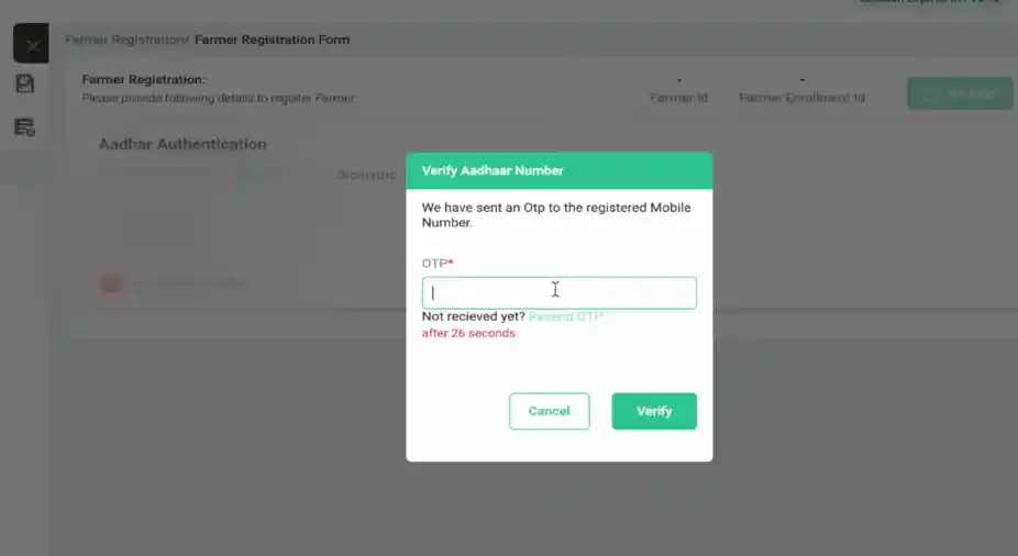 • लॉगिन करके सामने ही आपको Aadhar Authentication का सेक्शन दिखेगा, उसमें किसान का aadhar नंबर डाल कर OTP से वेरीफाई करें।