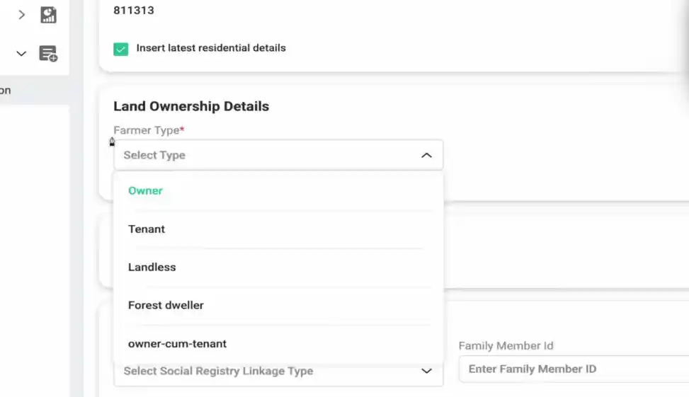 • फिर निचे आपको ‘Land Possession Particulars’ भरनी है, Farmer Kind में Proprietor, Tenant, Landless, Forest Dweller, Proprietor-Cum-Tenant आदि ऑप्शन में से अपनी लैंड के अनुसार ऑप्शन सेलेक्ट करनी है।