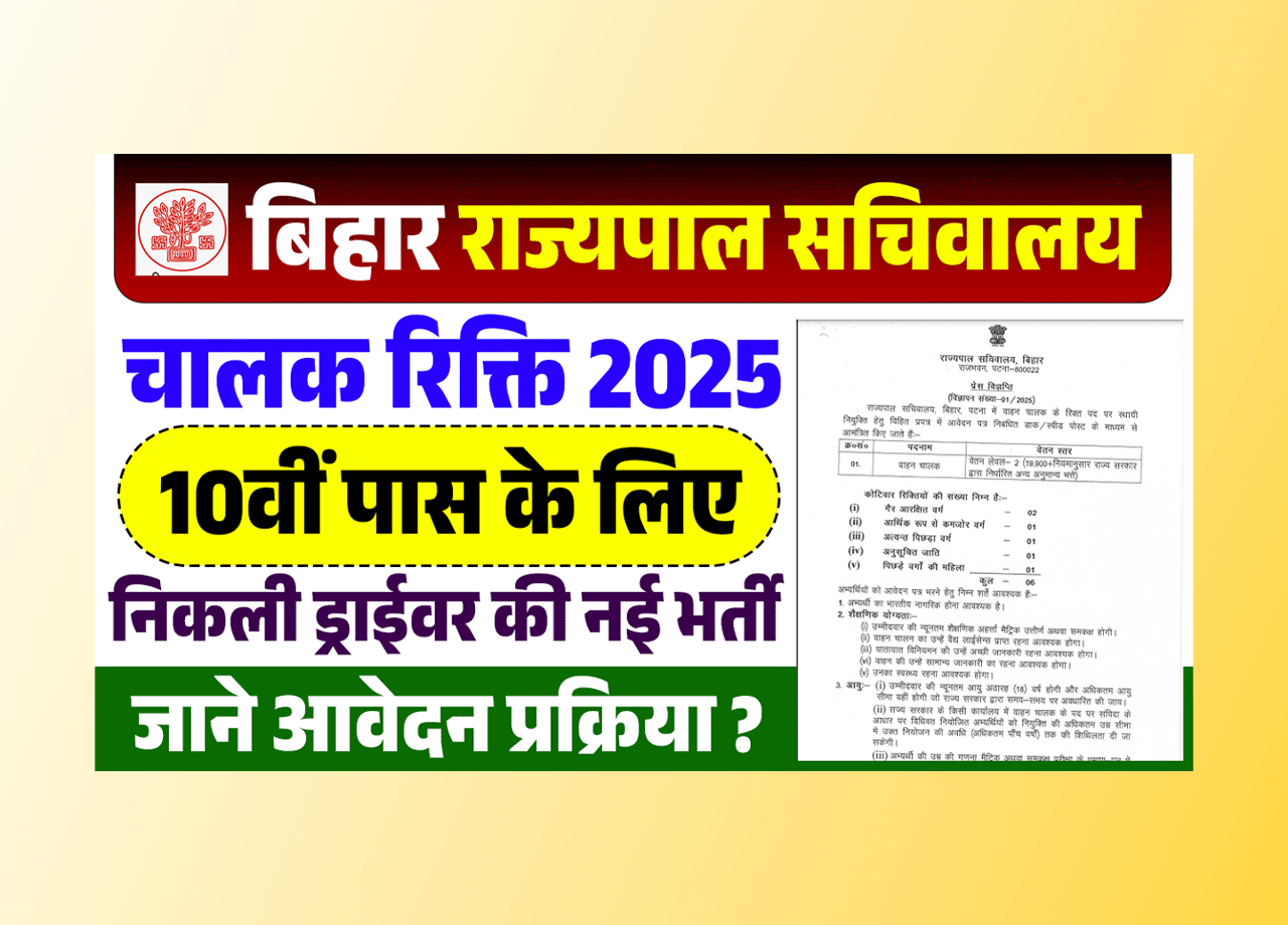 अपने इस आर्टिकल मे आप सभी युवाओं सहित उम्मीदवारों का स्वागत करते हुए आपको बताना चाहते है कि, बिहार राज्यपाल सचिवालय की तरफ से ड्राईवर की नई भर्ती को जारी किया गया है जिसमे आप सभी योग्य आवेदक, आवेदन करके नौकरी प्राप्त करने का सुनहरा अवर प्राप्त कर सकते है और इसीलिए आपको इस आर्टिकल मे विस्तार से Bihar Governor Secretariat Driver Emptiness 2025 की जानकारी प्रदान करेगें ताकि आप पूरी – पूरी जानकारी प्राप्त कर सकें।