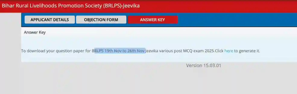 Bihar Rural Livelihoods Promotion Society (BRLPS) द्वारा JEEVIKA Recruitment Examination 2025 के अंतर्गत Space Coordinator पद के लिए आयोजित लिखित परीक्षा की Reply Key एवं Response Sheet आधिकारिक वेबसाइट पर जारी कर दी गई है।