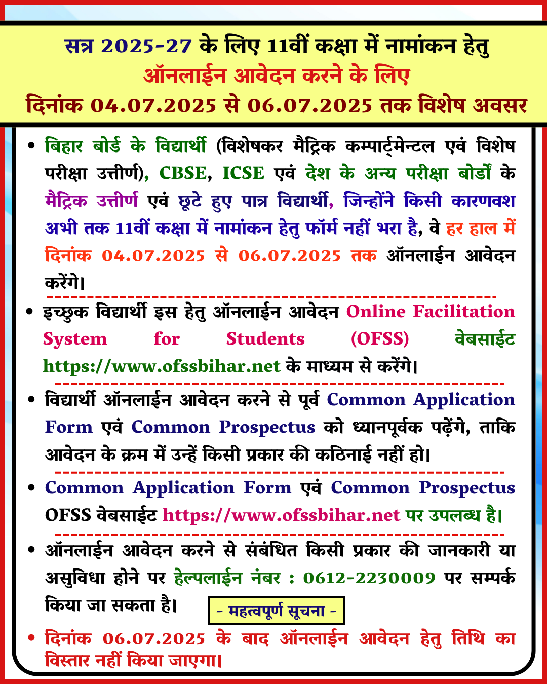 OFSS eleventh Admission 2025: क्या आप भी बिहार बोर्ड से 10वीं पास करने के बाद 11वीं कक्षा मे दाखिला लेना चाहते है और ओएफएसएस 11वीं एडमिशन नोटिफिकेशन 2025 जारी होने का इंतजार कर रहे है उनके लिए धमाकेदार खुशखबरी है कि, सत्र 2025 – 2027 के लिए बिहार विद्यालय परीक्षा समिति, पटना द्धारा OFSS Bihar eleventh Admission 2025 (Re-Open) नोटिफिकेशन को 03 July, 2025 के दिन जारी कर दिया गया है जिसकी पूरी – पूरी जानकारी हम, आपको इस आर्टिकल मे प्रदान करेगें ताकि आप पूरी – पूरी जानकारी प्राप्त कर सकें और दाखिला हेतु तैयारी कर सकें।