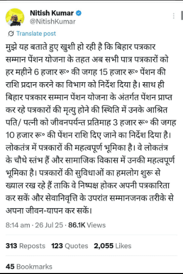 इस घोषणा को जारी करते हुए बिहार के मुख्यमंत्री श्री. नीतिश कुमार जी ने कहा है कि, ” मुझे यह बताते हुए खुशी हो रही है कि, बिहार पत्र सम्मान पेंशन योजना के तहत अब सभी पात्र पत्रकारों को हर महिने ₹ 6 हजार रुपय की जगह पर ₹ 15 हजार रुपय की पेंशन राशि प्रदान करने का विभाग को निर्देश दिया गया है। साथ ही बिहार पत्रकार सम्मान पेंशन योजना के अन्तर्गत पेंशन प्राप्त कर रहे पत्रकारों की मृत्यु होने की स्थिति मे उनके आश्रित पति / पत्नी को जीवनपर्यन्त ₹3 हजार रुपय की जगह पर अब ₹ 10 हजार रुपय की पेशन राशि दिए जाने का निर्देश दिया गया है। लोकतंत्र मे पत्रकारों की महत्वपूर्ण भूमिका है। वे लोकतंत्र के चौथे स्तम्भ है औऱ सामाजिक विकास मे उनकी महत्वपूर्ण भूमिका है। पत्रकारों की सुविधाओं को हम लोग शुुरु से ख्याल रख रहे है ताकि वे निष्पक्ष होकर अपनी पत्रकारिता कर सकें और सेवानिवृ़त्ति के उपरान्त सम्मानजनक तरीके से अपना जीवन यापन कर सकें। ”