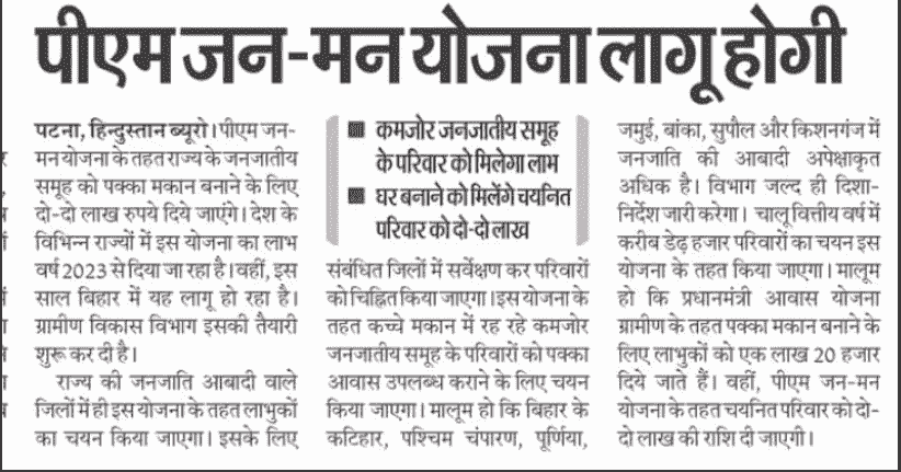 पीएम जन-मन योजना (PM Janman Yojna) के तहत अब बिहार के जनजातीय समूह को पक्का मकान बनाने के लिए दो-दो लाख रुपये दिये जाएंगे।
