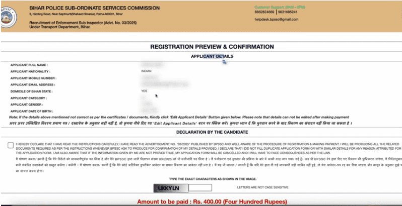 ₹700 (UR/EBC/BC/EWS) और ₹400 (SC/ST/Feminine/Third Gender of Bihar)।