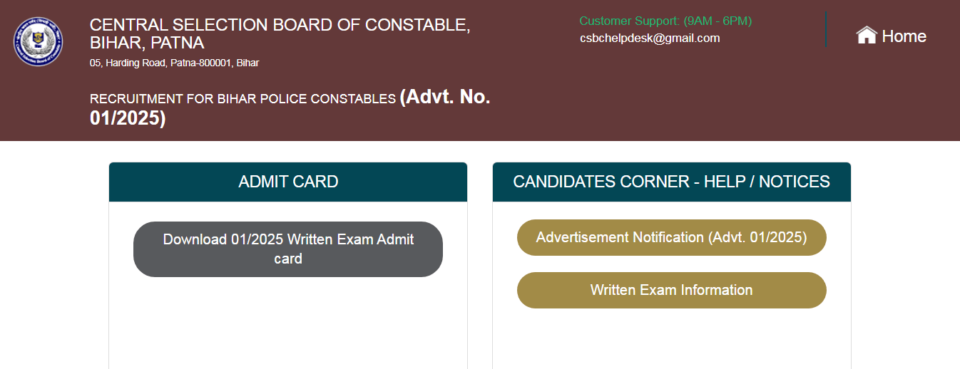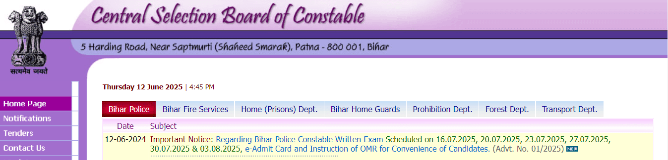 • Bihar Police Constable Admit Card 2025 को चेक व डाउनलोड करने के लिए सबसे पहले आपको इसकी Official Web site के होम – पेज पर आना होगा जो कि, इस प्रकार का होगा –